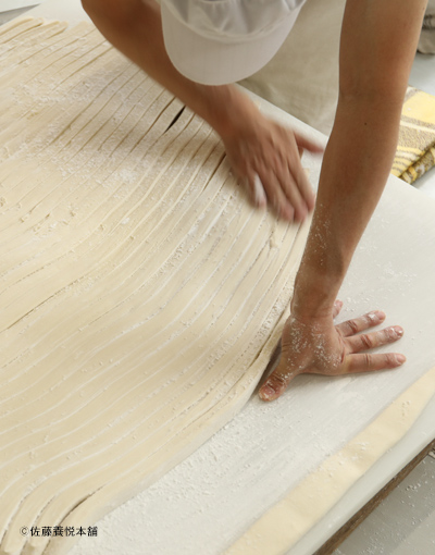 稲庭うどんは、小麦粉と塩水を練っては熟成させて生地を作り、手綯(てな)いして延ばし乾燥させて作りますが、当社では全工程を職人の手仕事で行っていますので、完成までには4日程かかります。また、職人全員が互いの出来を評価しながら一斉に工程を進めることで技と品質の維持に努めており、生地にしっかりと向き合えるよう工場には時計を置いておりません。職人は、香りや弾力等の生地のメッセージを敏感に読み取りながら身体を動かし、熟練の技と感覚で仕上げています。